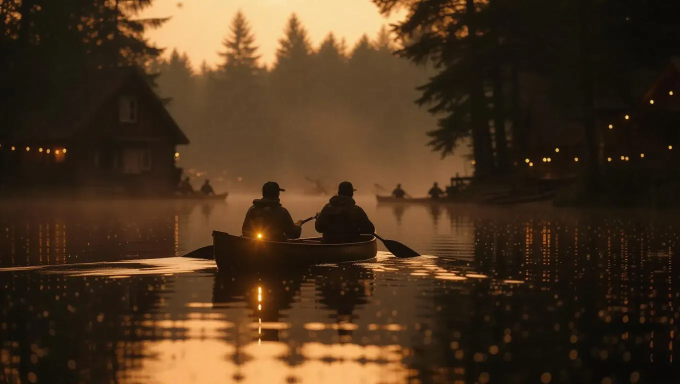 A getaway canoe paddles silently through a fog-covered lake village, its occupants narrowly escaping police canoes. The ambiance is created by the gentle gleam of fireflies and the cool mist of the water.