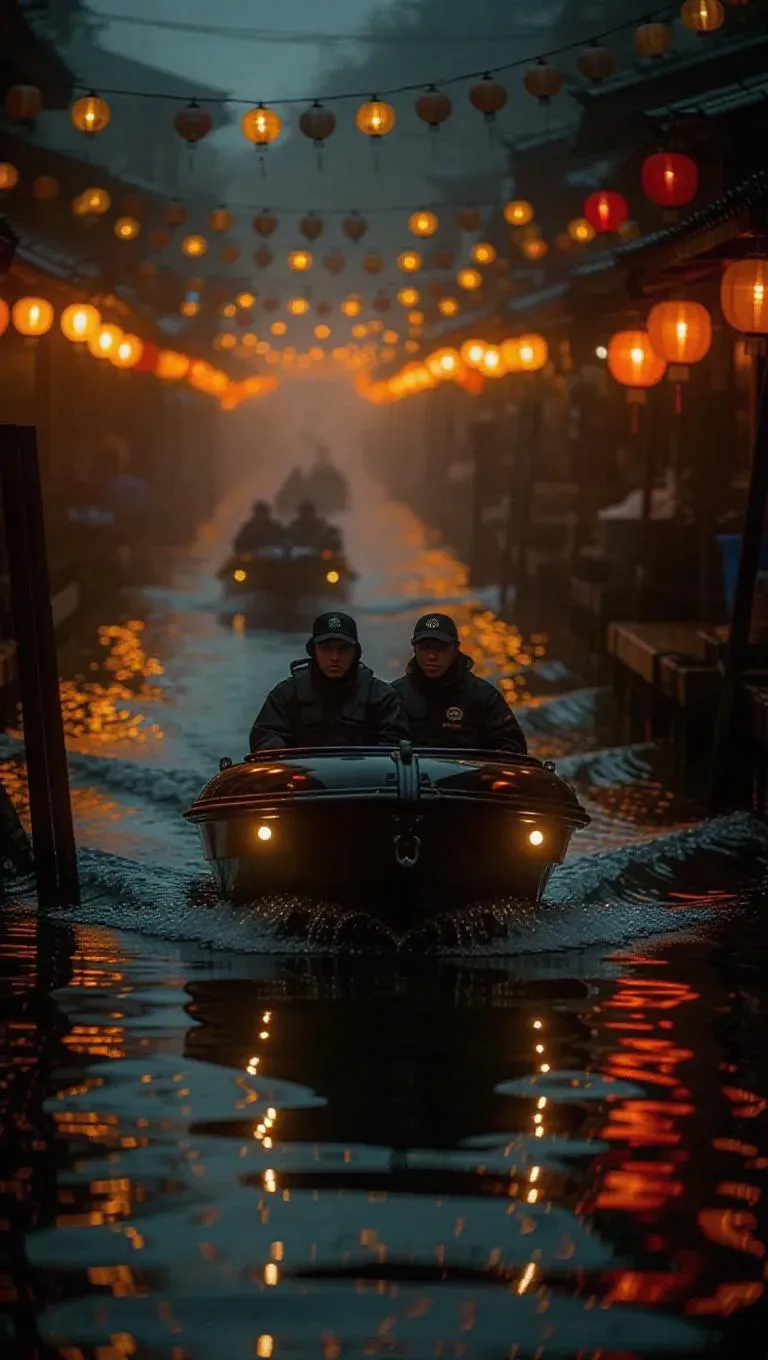 A getaway speedboat scurries through a misty fishing harbor, its crew skillfully sidestepping police patrols. The scene is charged with the warm glow of lanterns and the chilling fog of the shoreline.