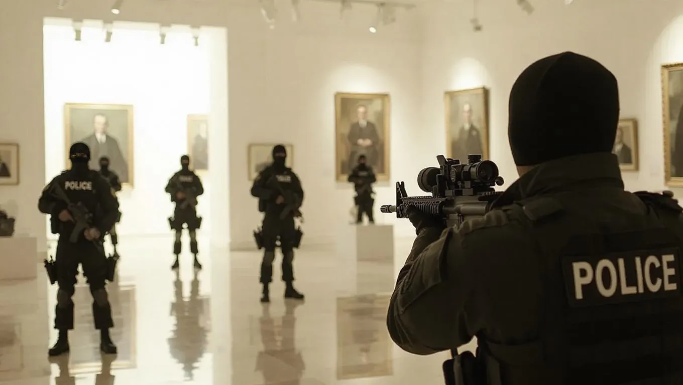 A gang takes hostages in a cultural museum, with police snipers perched atop exhibits. The scene is framed with an educational, enlightening tone, highlighting the tension and isolation.