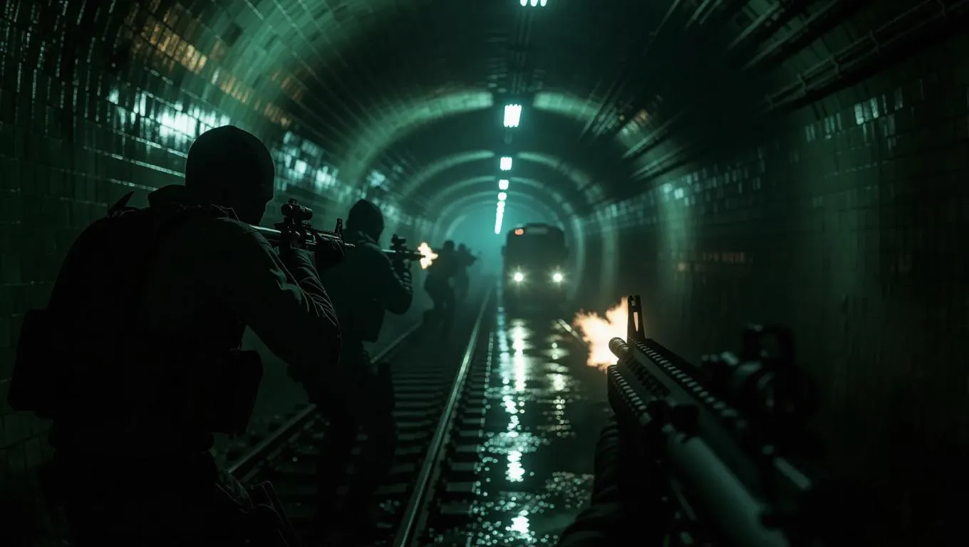 A crew ambushes a gang in a dark underpass, their weapons glinting in the flickering light, echoes reverberating off the damp walls. A distant train horn sounds, adding to the tension. The scene is captured with a gritty, urban aesthetic, emphasizing the raw energy and danger.