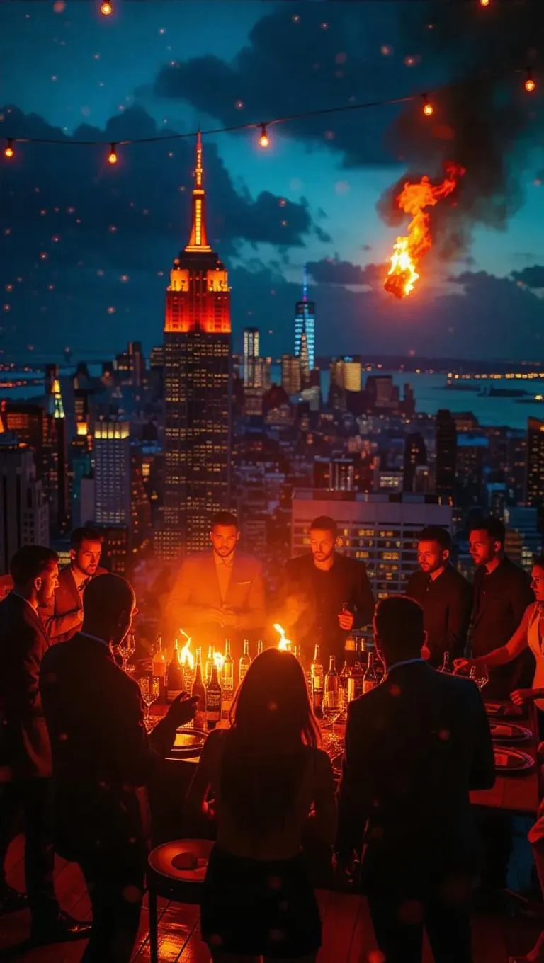 A lavish rooftop party erupts into chaos as rival gangs clash over a high-stakes auction. The city skyline glows under a star-filled sky, with flames frolicking in the wind. The scene is captured with an artistic, high-contrast tone, emphasizing the tension and excitement.