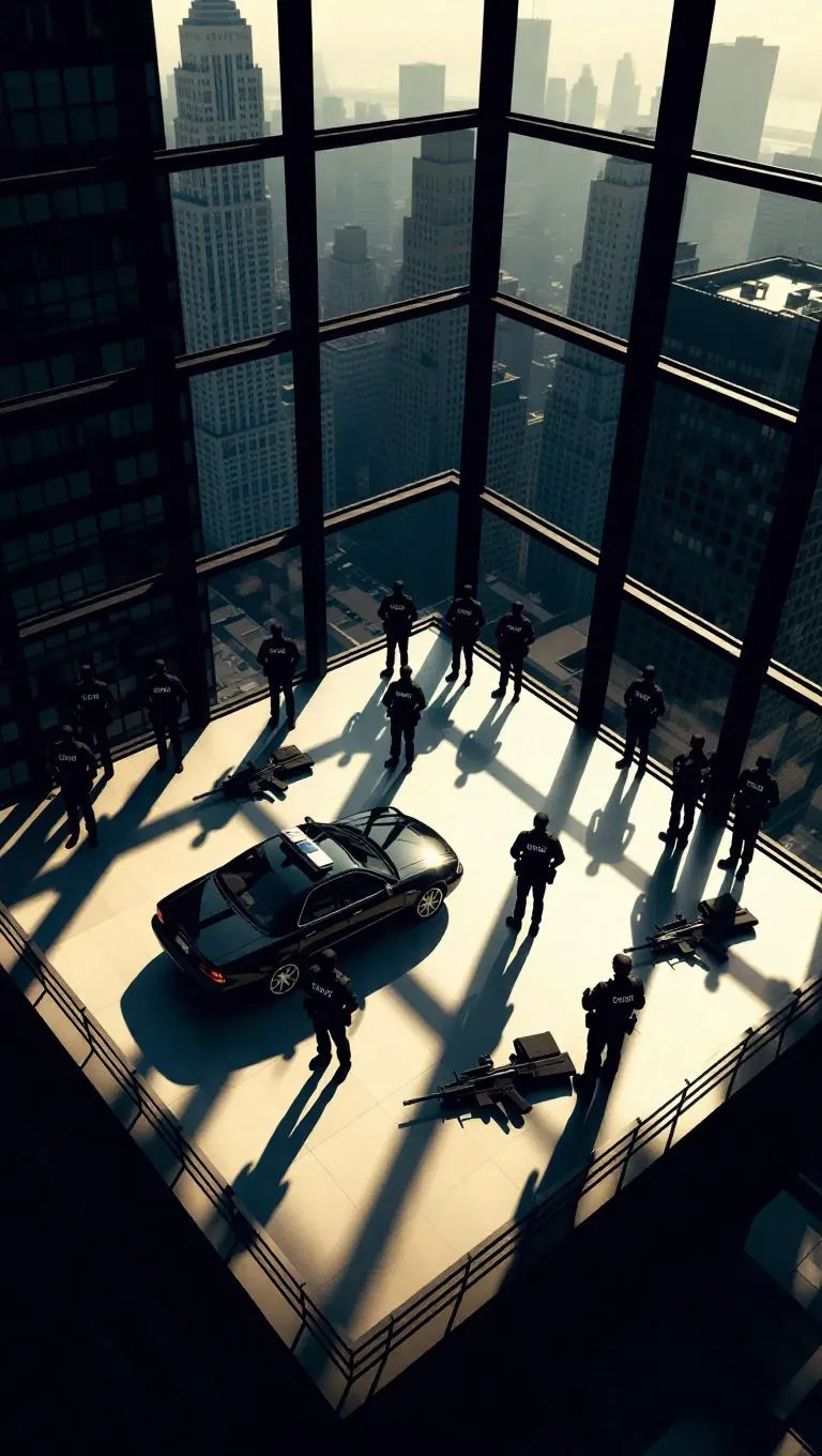 A gang takes hostages in a luxury penthouse, with police snipers positioned on nearby rooftops. The scene is framed with a cold, clinical tone, emphasizing the tension and isolation.