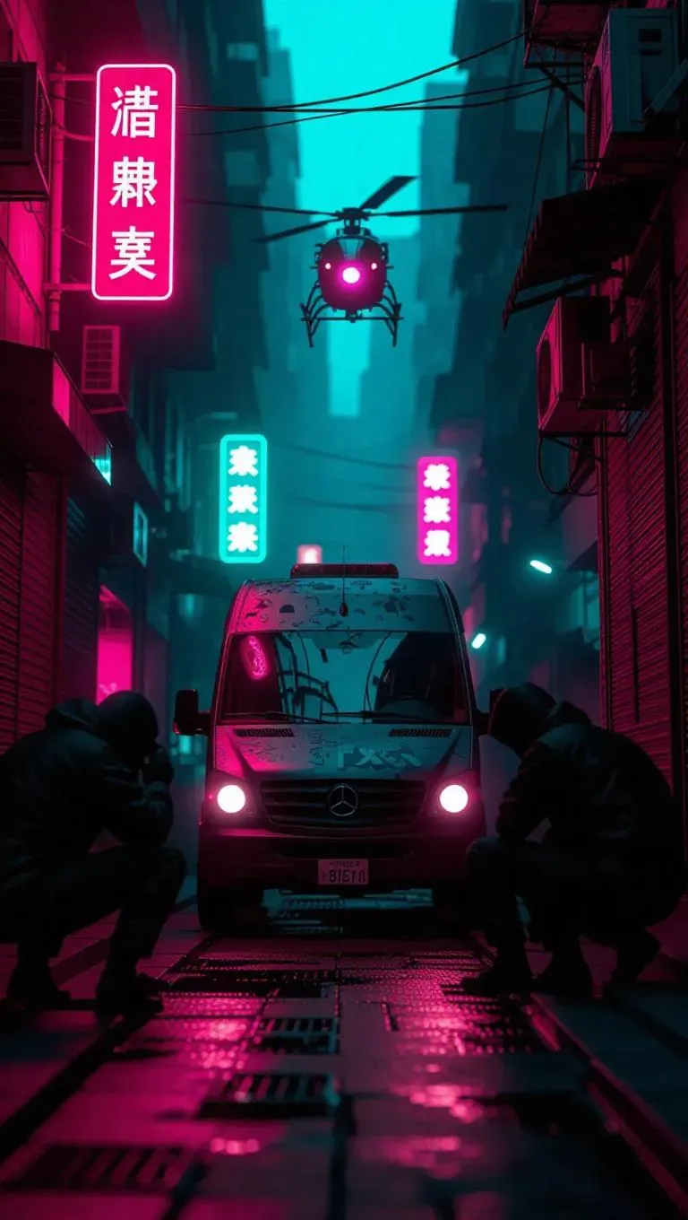 In a dimly lit alleyway, a crew of masked thieves huddle around a stolen armored van, its engine still warm. Neon signs flicker above, casting a mix of teal and magenta hues over their determined faces. A police chopper circles in the distance, its spotlight piercing the fog. Soft curves and a muted pastel palette emphasize the gritty urban setting.