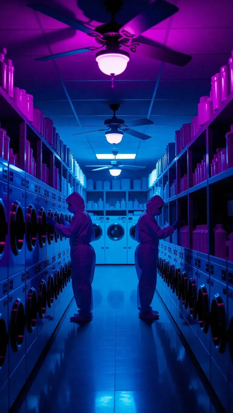 A drug lab hidden beneath a laundromat glows with ultraviolet light, shelves filled with supplies, as figures in protective gear hustle to destroy evidence before a raid. Ceiling fans cast eerie rotating shadows across a ceiling display. Tense neon-dystopia interior with gritty atmosphere.