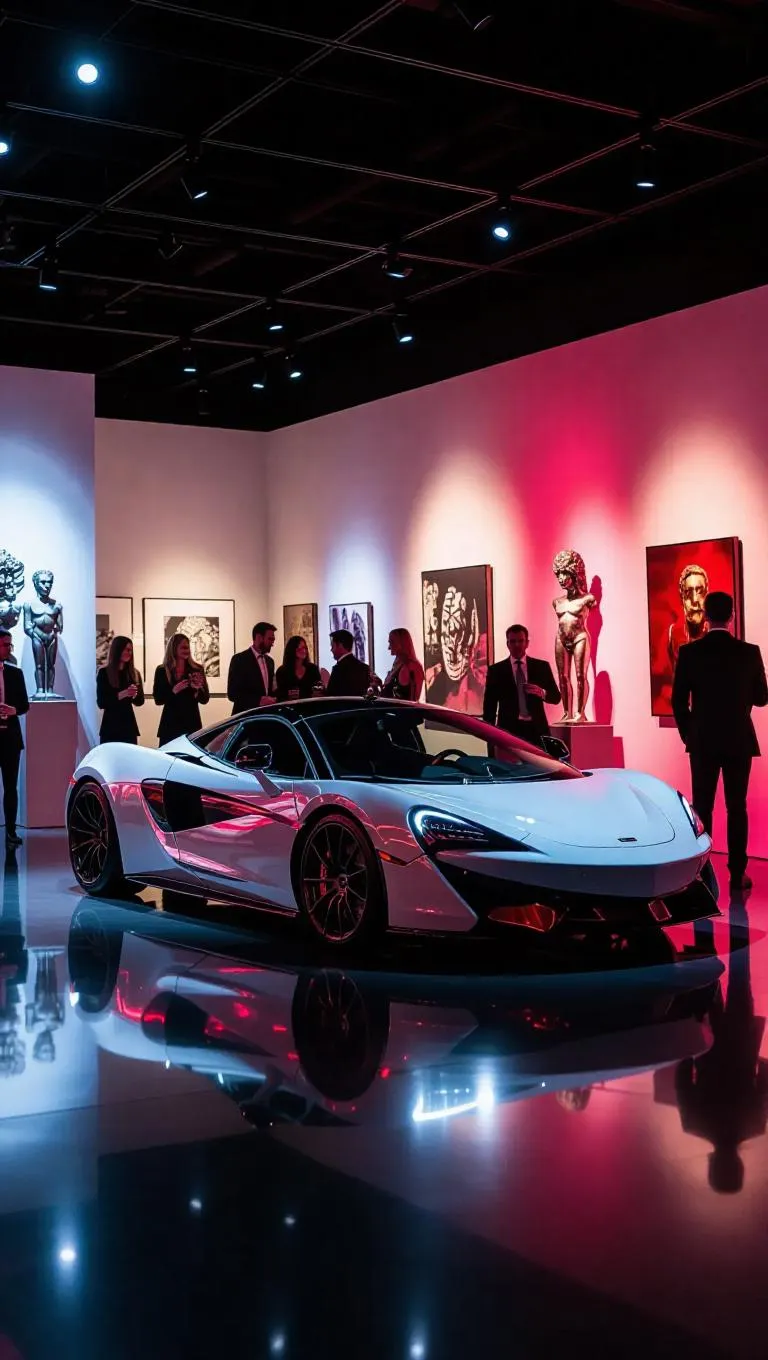 A stolen supercar skids to a stop in front of an art gallery, its undercarriage illuminated by spotlights. White and red reflections glint off the vehicle’s smooth surface, echoed by the intriguing sculptures displayed around. Nearby, guests dressed in formal attire examine the exhibits, while champagne flutes clink in celebration. The scene is filled with sophistication and glamour, captured in elegant angles, soft ambient light, and pulsating rhythms reflecting speed and culture.