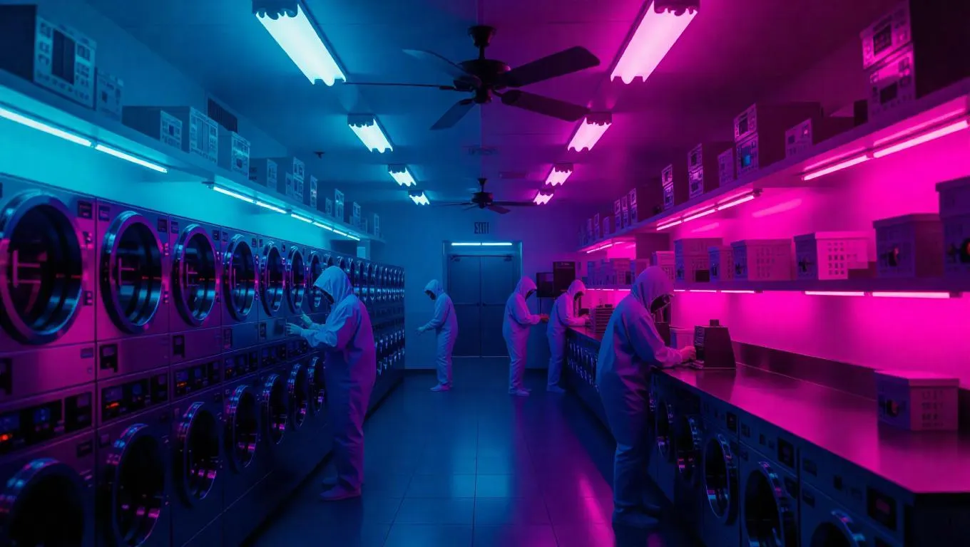 A drug lab hidden beneath a laundromat glows with ultraviolet light, shelves bearing unusual items, as figures in safety gear scramble to destroy evidence before a raid. Ceiling fans cast eerie rotating shadows across digital controls. Tense neon-dystopia interior with modern texture.