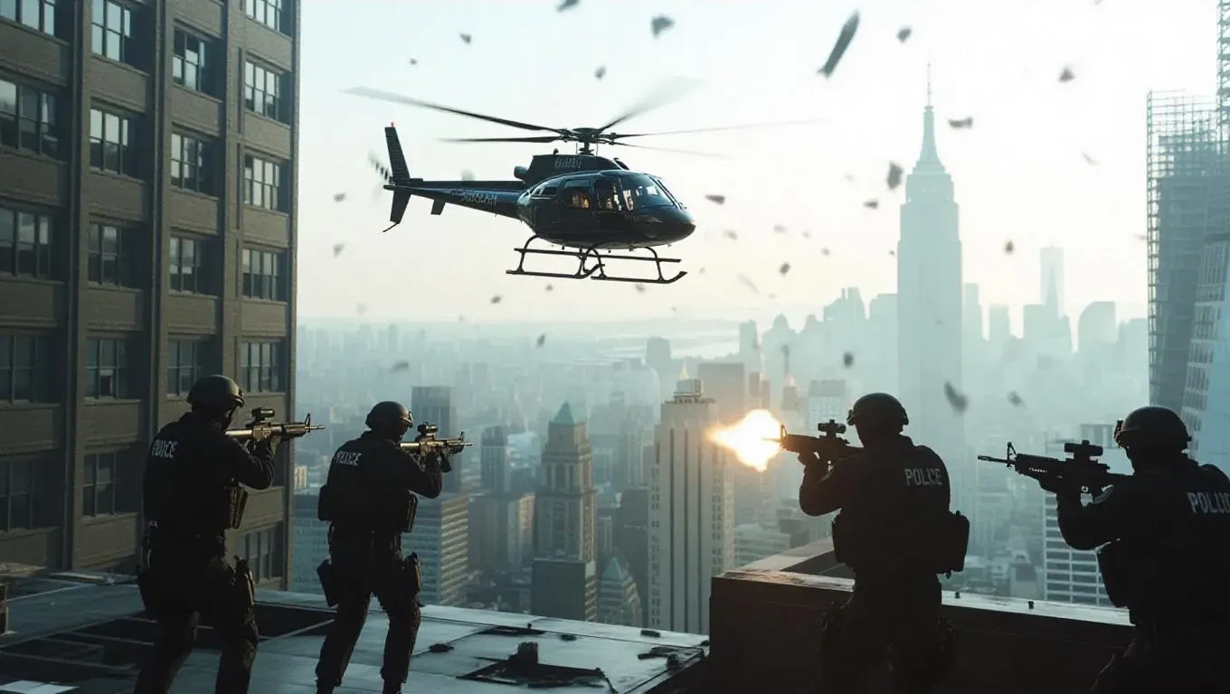 A stolen helicopter lifts off from a skyscraper rooftop, rotors whipping up debris, police snipers taking aim from adjacent buildings, shots narrowly missing, dramatic city skyline, cold desaturated tone, tension-filled atmosphere, urban chaos.