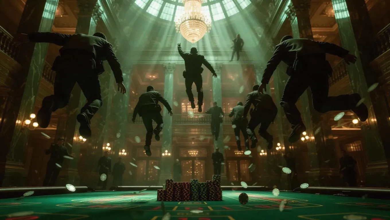 A dramatic casino heist in progress, shadowy figures rappelling into a grand atrium, glittering chips and money caught midair in slow motion. Giant marble sculptures and wool carpets contrast the chaos. Dynamic close-up camera shot, freeze-frame intensity with emerald green lighting.