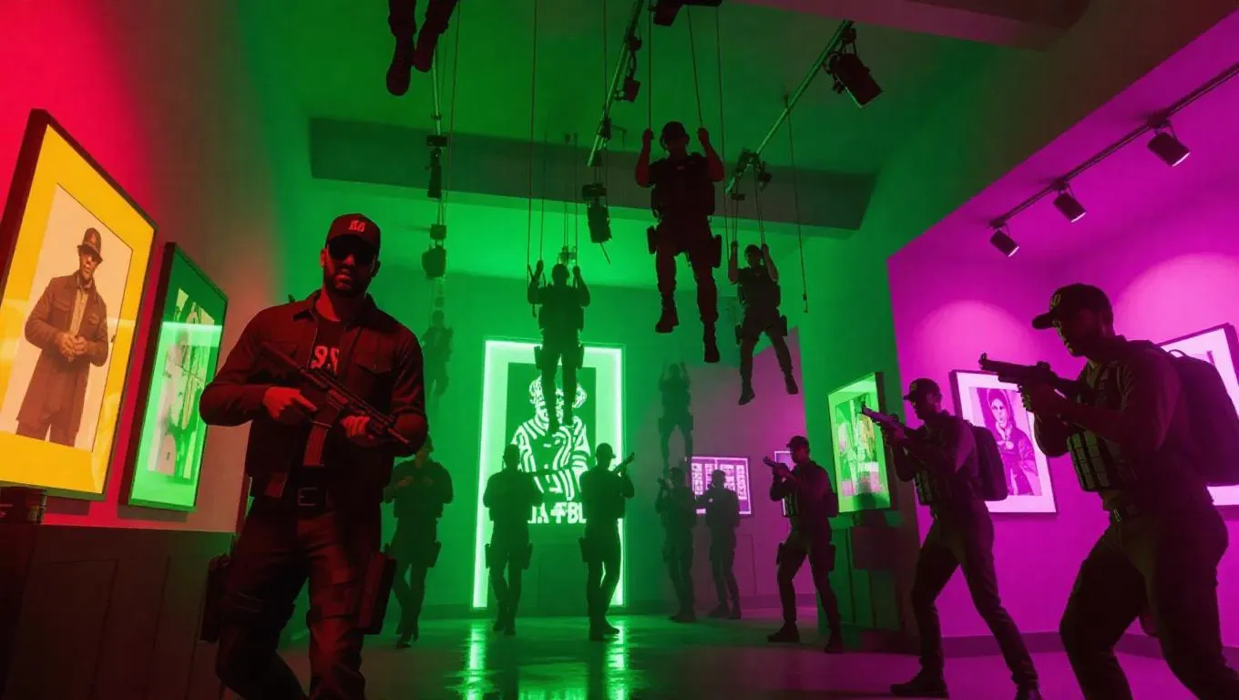 Inside a trendy art gallery in Liberty City, a high-stakes heist unfolds. Thieves, clad in casual streetwear, descend from the ceiling using ropes, stealthily stealing priceless artifacts. Alarms blare, casting a chaotic green glow, as security guards sprint through the halls, guns drawn, to intercept the criminals.