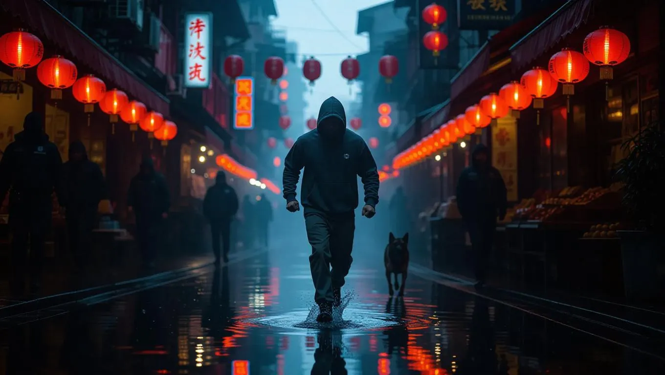 A fugitive in a patched hoodie surges through a misty Chinatown market, neon signs casting reflections on puddles behind him, as police dogs growl nearby. Lanterns illuminate the looming surroundings. Aerial drone shot with immersive depth and environmental storytelling.