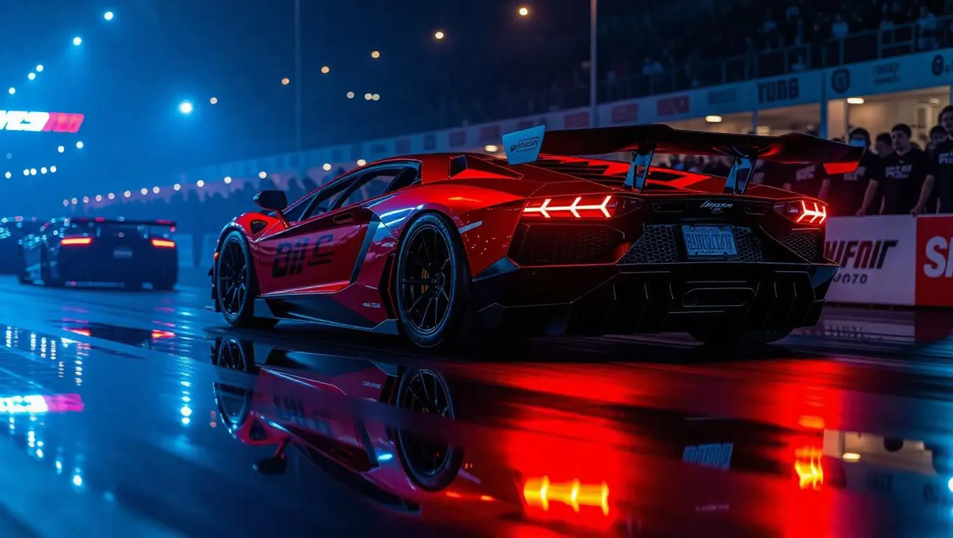 A stolen supercar revs at a drag race, its undercarriage glowing under intense stage lights. Blue and orange reflections shimmer across the vehicle's polished exterior, mirrored in the fascinated spectators' eyes. Nearby, pit crews tend to other cars, while the announcer's voice crackles with energy. The atmosphere bursts with competition and excitement, captured in high-octane angles, radiant bright lights, and dynamic movements reflecting speed on the track.