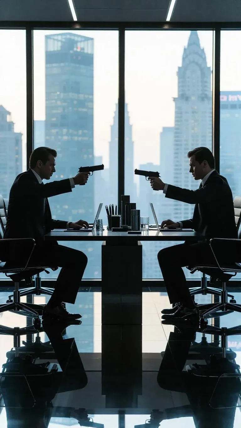 Two rival gangs confront each other in a corporate boardroom, weapons clashing and echoing off the glass walls. Sleek furniture and city views enhance the chaotic atmosphere. The scene is captured with a sterile, professional palette, emphasizing tension and danger.