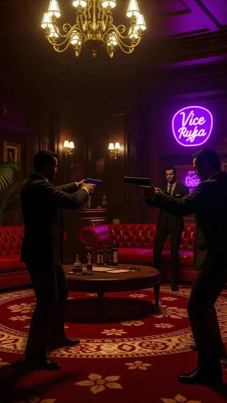 In a plush private club in Vice City, a tense power struggle erupts between two crime lords. Guns are drawn, and the opulent lounge, filled with comfortable couches and a lavish bar, transforms into a high-stakes battleground as the two men fight for dominance.