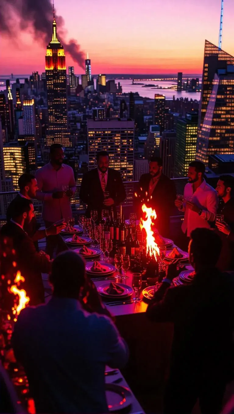 A lavish rooftop party erupts into chaos as rival gangs clash over a high-stakes jewel smuggling operation. The city skyline is painted in deep crimson colors, with flames that seem to dance joyfully. The scene is captured with a lively, high-contrast tone, emphasizing the tension and excitement.