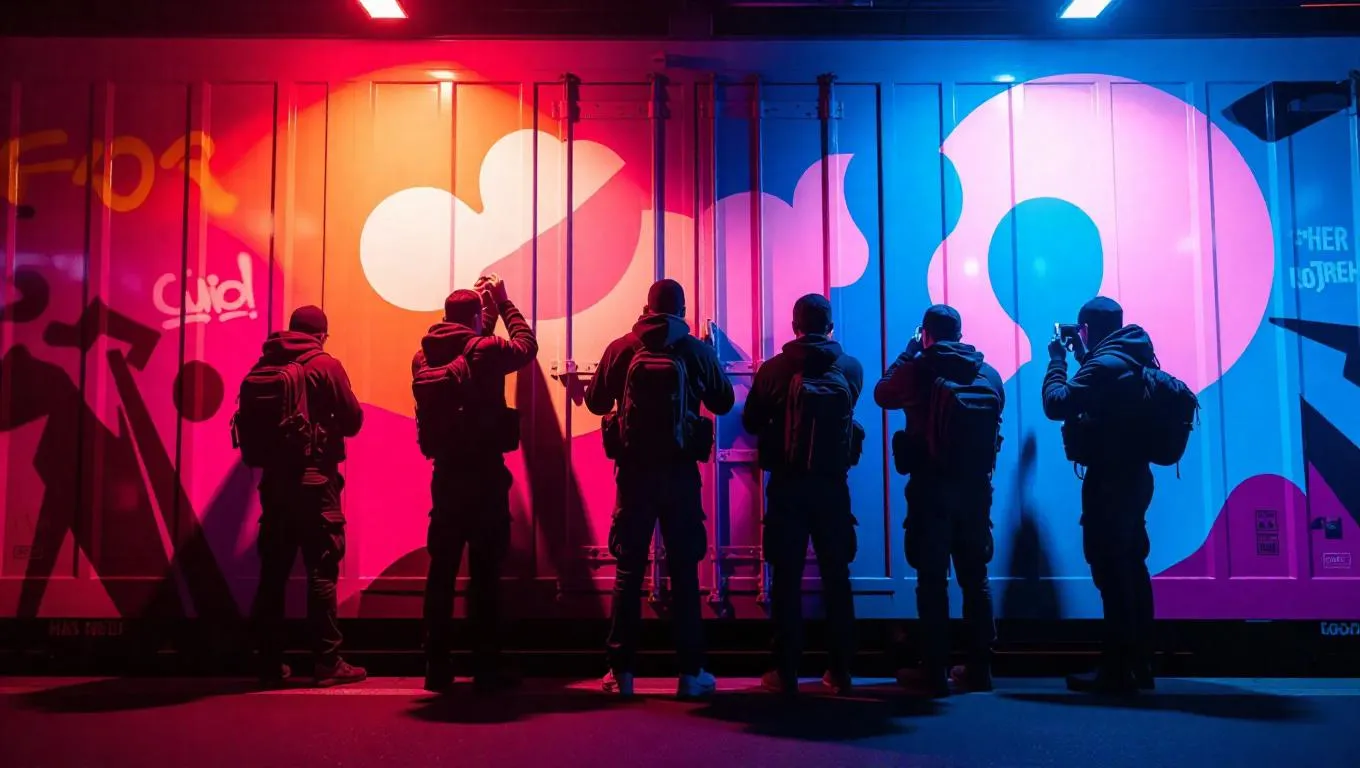 A team of street artists is decorating a massive mural on a railway car, their silhouettes framed by the soft light of a streetlamp. The sound of police sirens echoes in the air, suggesting urgency. The setting is rich with an edgy urban theme and a muted color range.