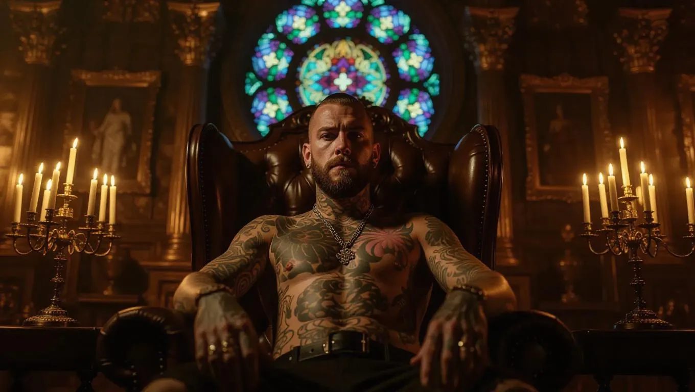 A heavily-tattooed gangster sits upright in a tall-backed armchair inside a baroque-style temple turned hideout, gold candles flickering beside assault rifles and mystical artifacts. A stained-glass dragon glows behind him, casting fractured color across his face. Baroque lighting meets street crime with chiaroscuro styling.