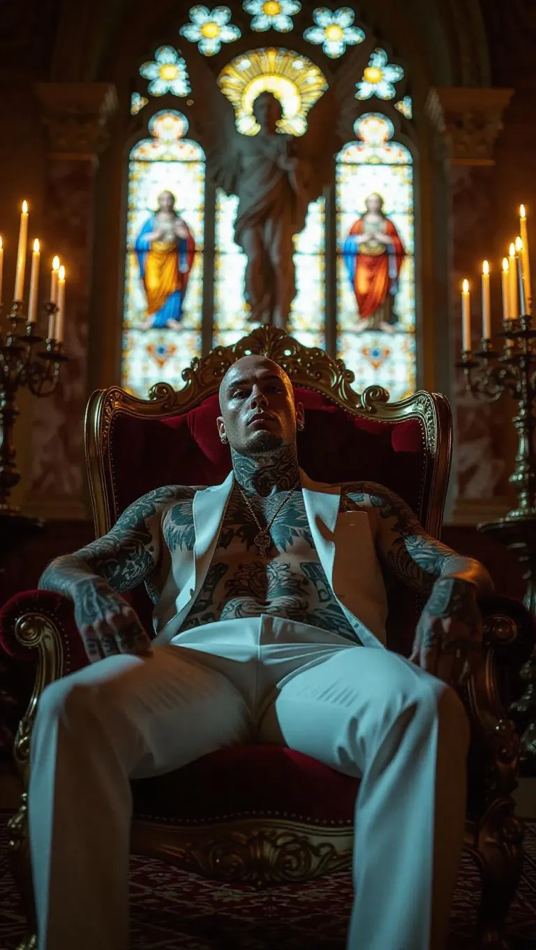 A heavily-tattooed gangster lounges in an ornate armchair inside a neo-classical church turned hideout, gold candles flickering beside assault rifles and sacramental wine. A stained-glass archangel glows behind him, casting fractured color across his face. Baroque lighting meets street crime with chiaroscuro styling.
