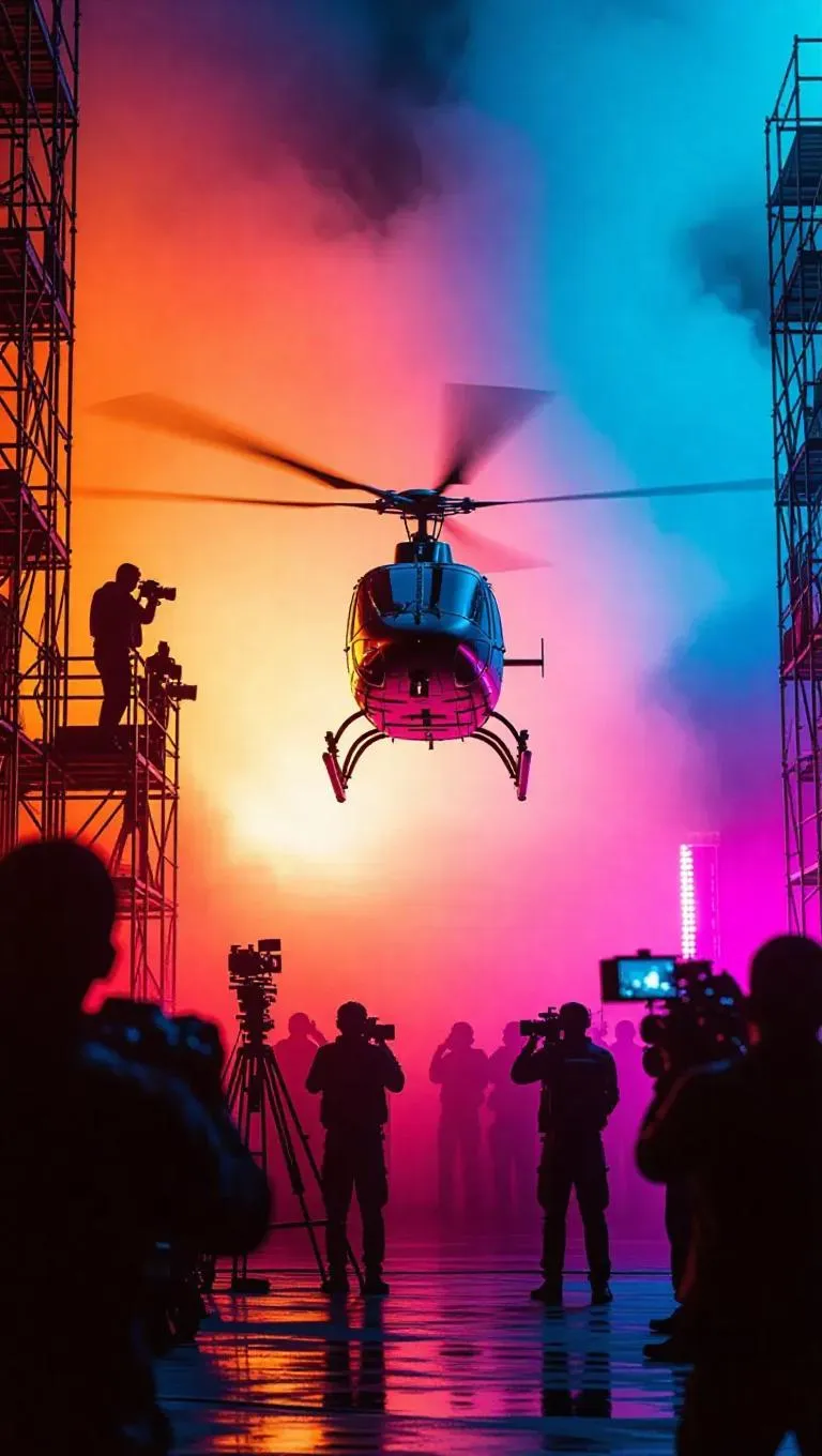 A stolen helicopter lifts off from a film set, rotors whipping up equipment, crew members taking aim from scaffolding, shots narrowly missing, dramatic cinematic scene, colorful vibrant tone, tension-filled atmosphere, filmmaking chaos.