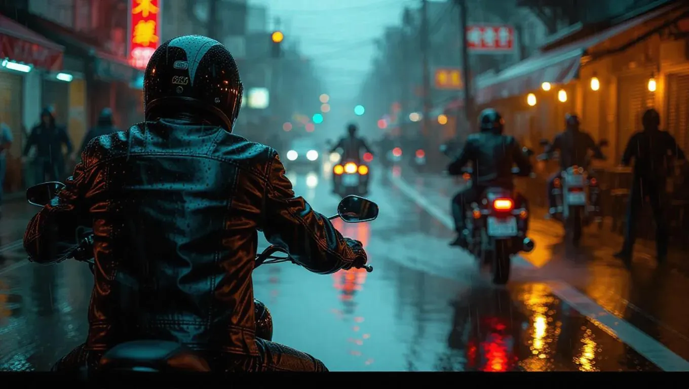 A biker gang speeds through a rain-soaked street, leather jackets soaking up the downpour. Up ahead, a rival gang huddles under an awning, weapons glinting in the wet shine. Tension fills the air, captured with blurred lines and a dark, atmospheric color palette.