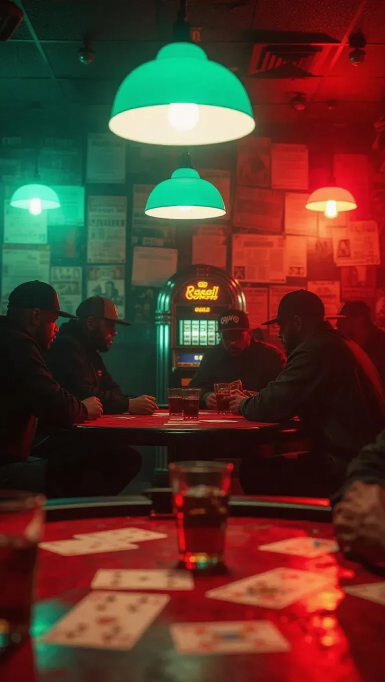 Inside a smoky pool hall, under flickering teal lamps, gang members crowd around a battered card table, weapons resting beside cocktail glasses. The walls sweat with age, paper flyers peeling back secrets of the streets. A jukebox flickers in the corner, stuck between static and a metal track. Isolated character lighting with strong foreground blur and edgy texture.