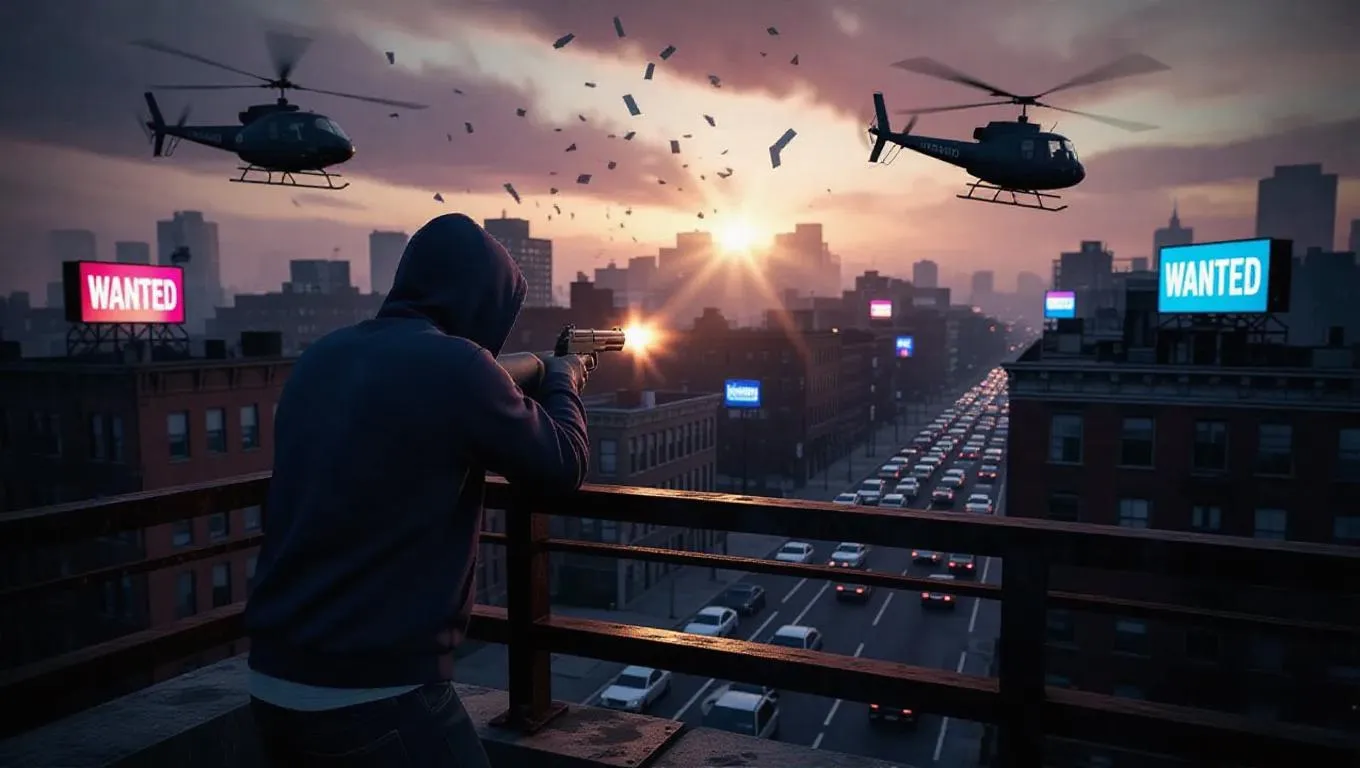 A rooftop standoff unfolds at twilight atop a decaying residential apartment, where a lone gangster in a navy hoodie levels a pistol at encroaching SWAT units. Helicopter rotors churn the dusk-hued smog, sending paper debris and dust spiraling across the skyline. Below, traffic snarls in a sea of headlights, while digital billboards flash “WANTED” warnings in vivid colors. Tension crackles in the haze, accentuated by sun flares slicing between rusted steel beams and neon signs. Dynamic third-person composition, chiaroscuro contrasts with muted tones.