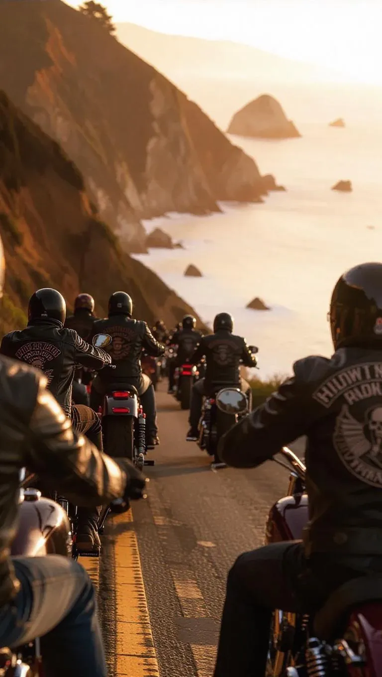 A biker gang races along a coastal highway, leather jackets flapping in the salty wind. Up ahead, a rival gang waits by a cliffside, weapons glinting in the dusk. Tension fills the air, captured with sweeping lines and a warm, golden color palette.