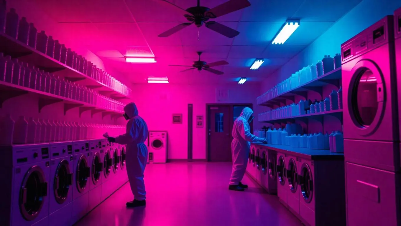 A drug lab hidden beneath a laundromat glows with ultraviolet light, shelves overflowing with materials, as figures in biohazard suits move quickly to destroy evidence before a raid. Ceiling fans cast eerie rotating shadows across a mechanical counter. Tense neon-dystopia interior with a distressed atmosphere.