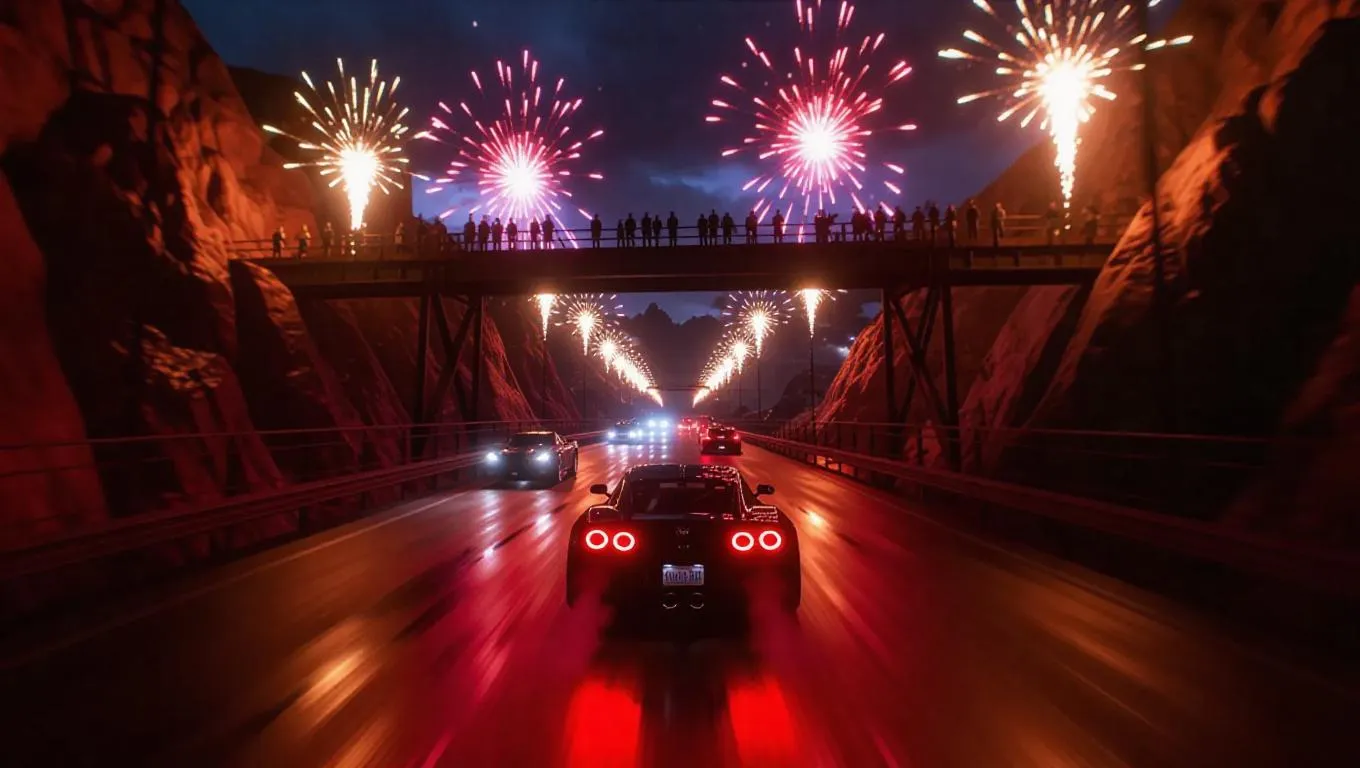 An unpredicted street race on a bridge above the gorge, engines roaring under the galaxy as fireworks explode in a flurry. Spectators line the sides, faces lit by flashes. High-speed cinematic motion and crystal clear-toned gradients.