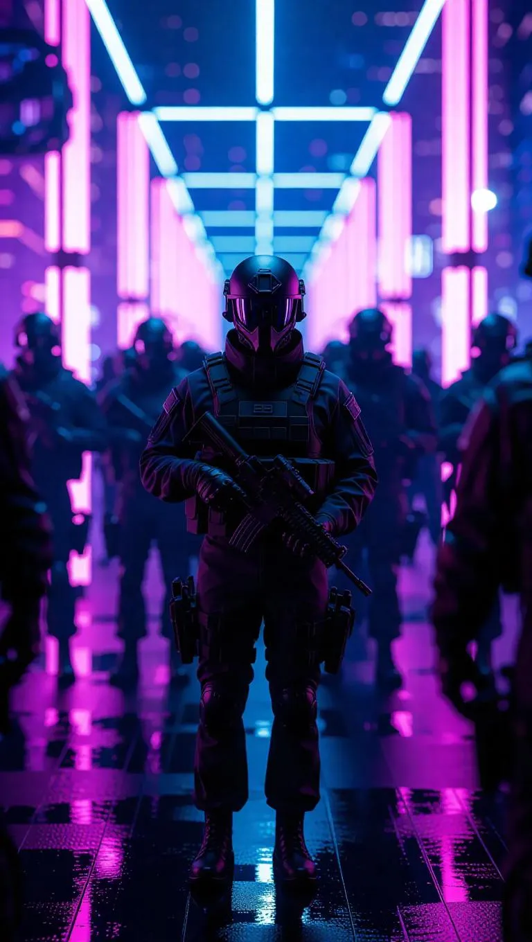 A clandestine meeting unfolds on a futuristic platform bathed in LED lights, where high-tech suit-clad negotiators flanked by armed guards exchange data disks. Below, the city breathes in futuristic pulses, and a sniper scope glints in the dark. Long-lens compression with cinematic bokeh, stylized atmospheric haze.