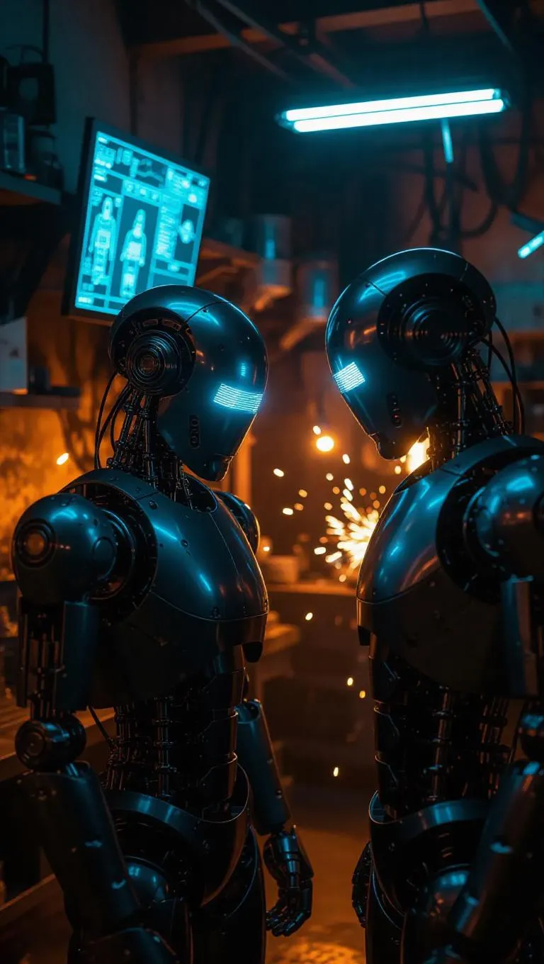 A clandestine shop hums with welding sparks, where humanoid robots are rebuilt for the syndicate. Holographic blueprints flicker on tarnished screens, and chrome brightens under ambient glow. Gritty cyber-crime aesthetic with oily reflections and heat distortion.