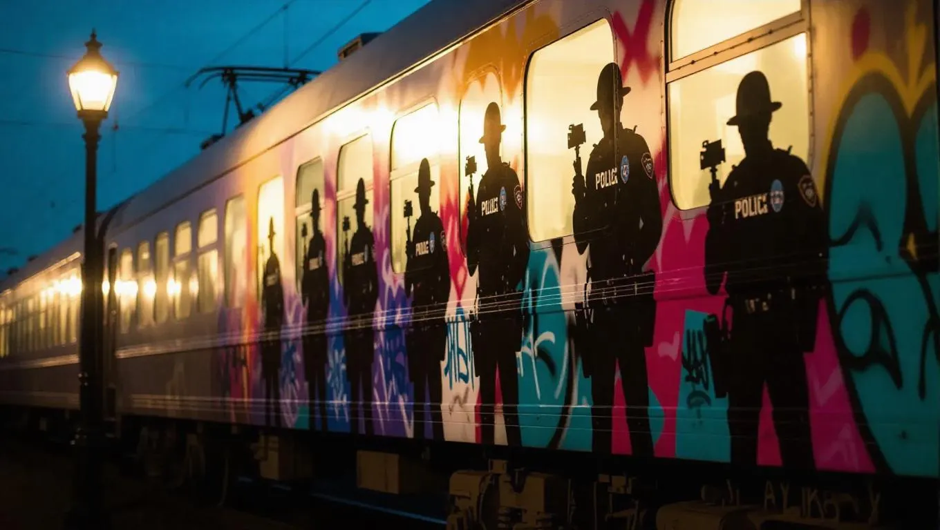 A number of street artists are engaged in spray-painting a stunning mural on the side of a moving train, their silhouettes cast by a nearby streetlamp. The ominous sound of police sirens resonates in the air. The atmosphere is filled with an edgy, urban aesthetic and a neutral color palette.
