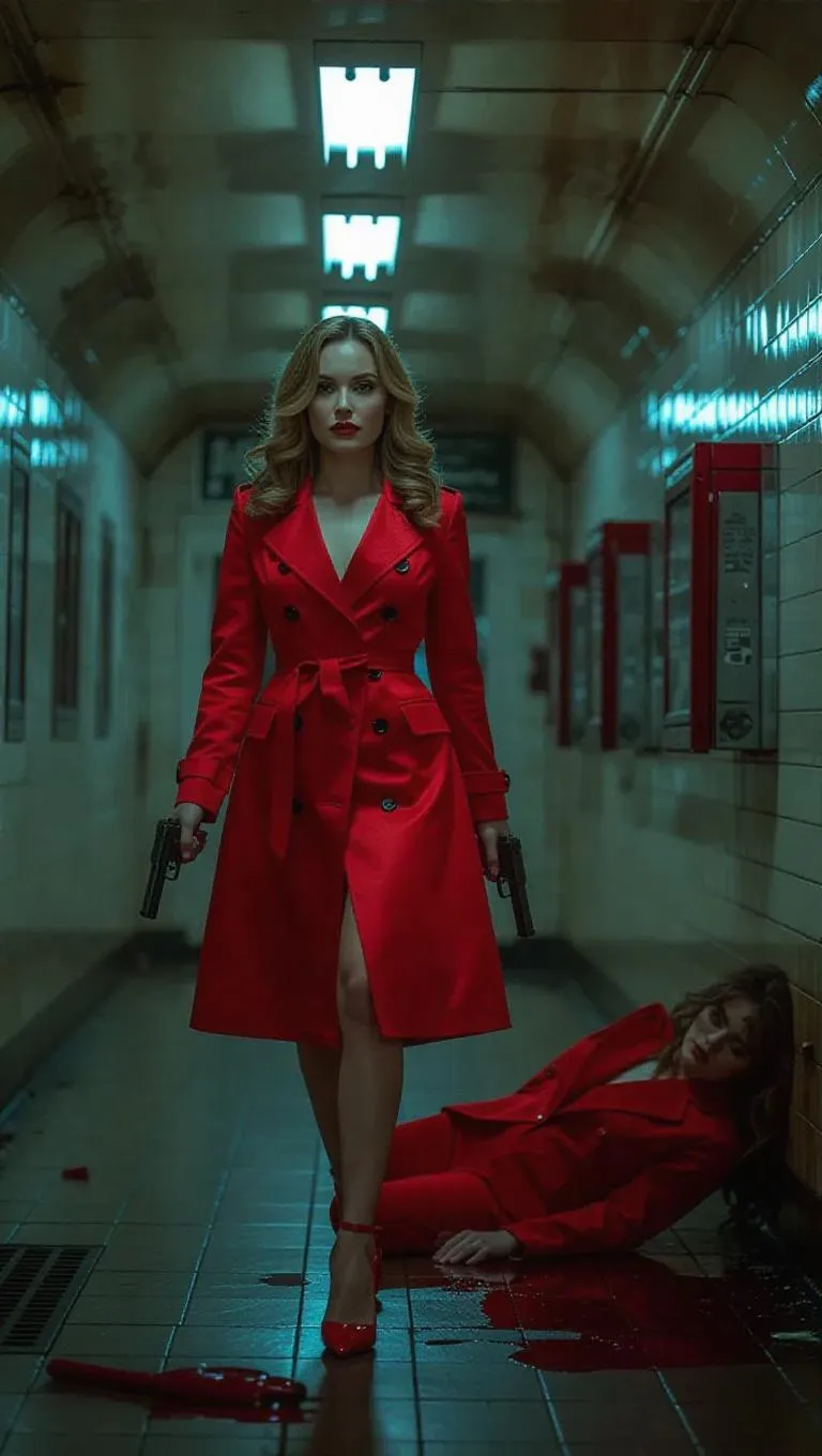 A stylish femme fatale in a blood-red trench coat walks through an empty subway station, heels echoing across the tiles, revolver in hand. A single fluorescent bulb flickers, illuminating a fallen body sprawled beside a shattered phone booth. Film noir styling, high contrast lighting, vintage palette.