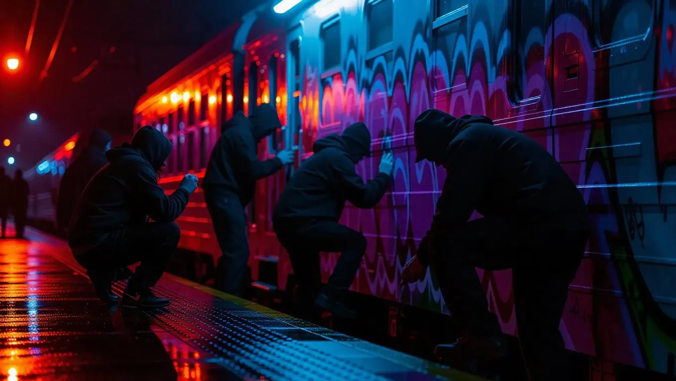 Several graffiti taggers are busy creating a mural on the side of a train, their outlines accentuated by the glow of a streetlight. Echoes of police sirens shimmer through the air. The scene is wrapped in a gritty, metropolitan texture and a soothing palette.