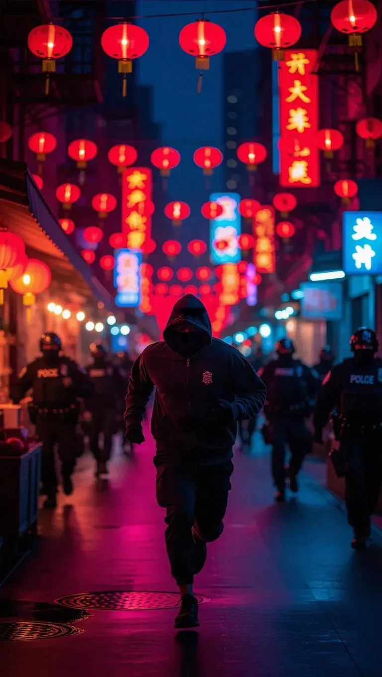 A fugitive in a shabby hoodie races through a lively Chinatown market, neon signs flashing vibrantly behind him, as police units race to intercept. Lanterns sway dramatically above. Overhead view with compelling depth and environmental storytelling.