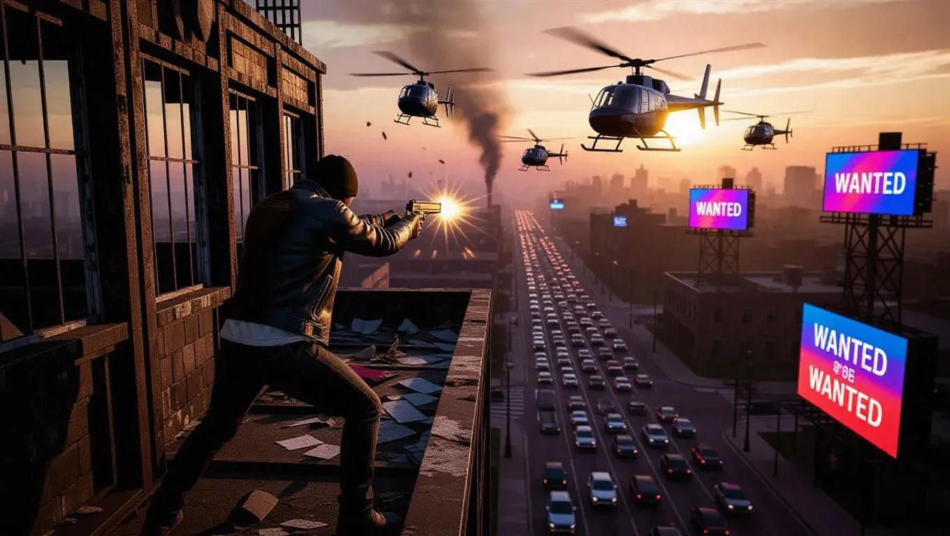 A rooftop standoff unfolds at golden hour atop a crumbling industrial tower, where a lone gangster in a black leather jacket levels a pistol at encroaching SWAT units. Helicopter rotors churn the dusk-hued smog, sending paper debris and dust spiraling across the skyline. Below, traffic snarls in a sea of headlights, while digital billboards flash “WANTED” warnings in neon colors. Tension crackles in the haze, accentuated by sun flares slicing between rusted steel beams and broken windows. Dynamic third-person composition, chiaroscuro contrasts with vintage hues.