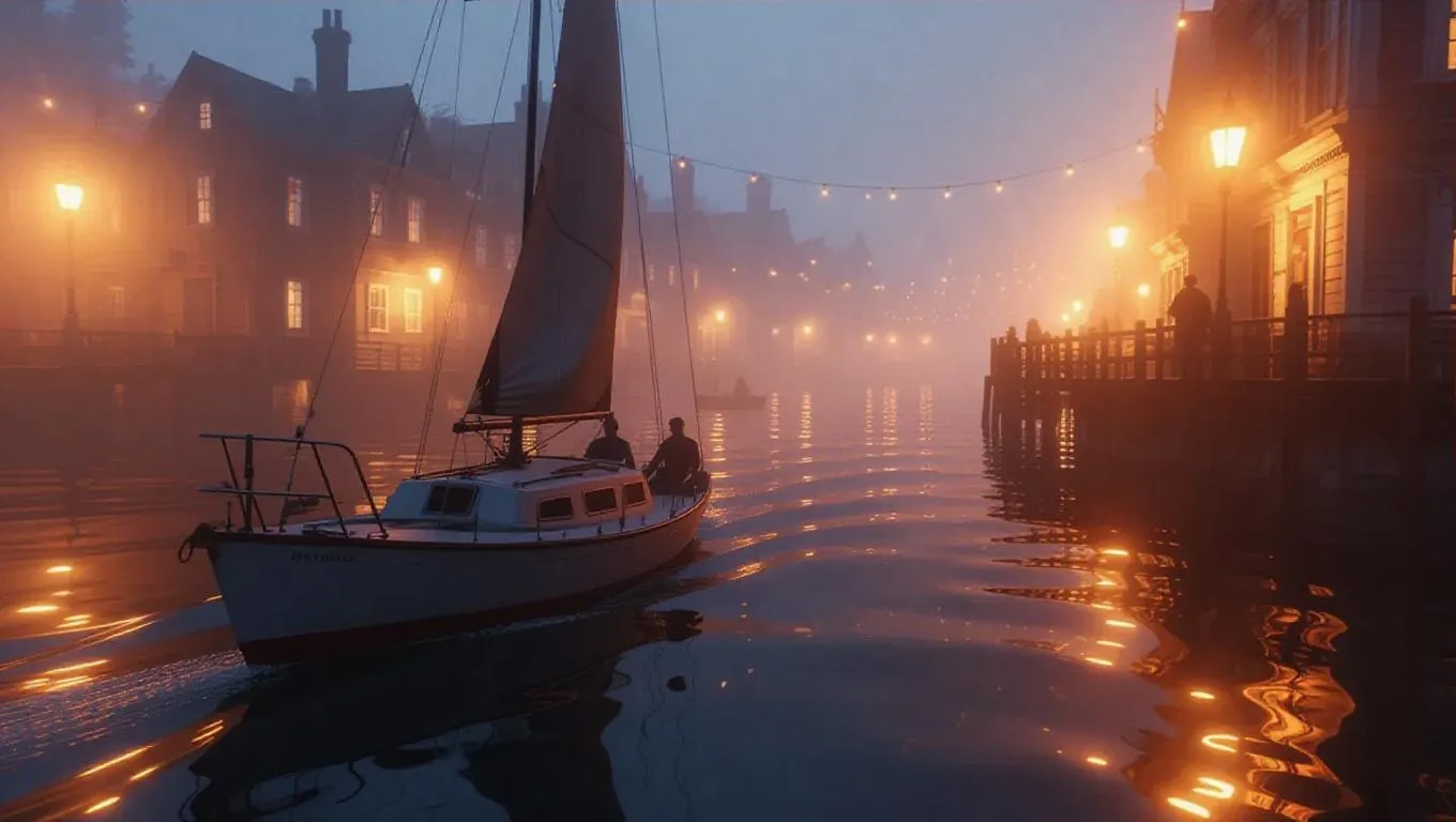 A getaway dinghy zips through a foggy bay community, its crew narrowly escaping police scrutiny. The atmosphere is highlighted by the soft flicker of street lamps and the dense mist of the ocean.