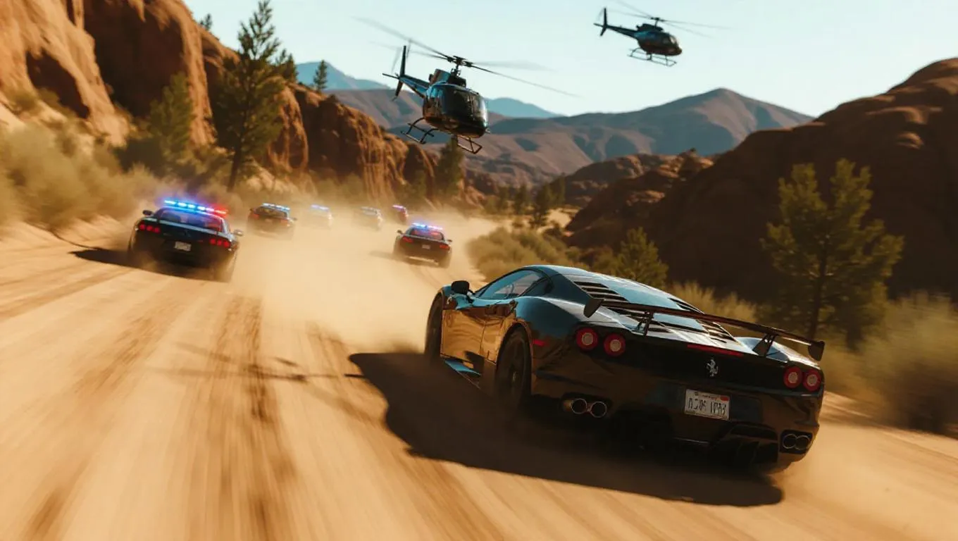 A stolen sports car speeds down a rugged dirt road, its tires screeching as it narrowly avoids a roadblock. Police cars and helicopters pursue relentlessly, their sirens creating a chaotic symphony. The scene is framed with dynamic motion blur and a gritty, cinematic palette.