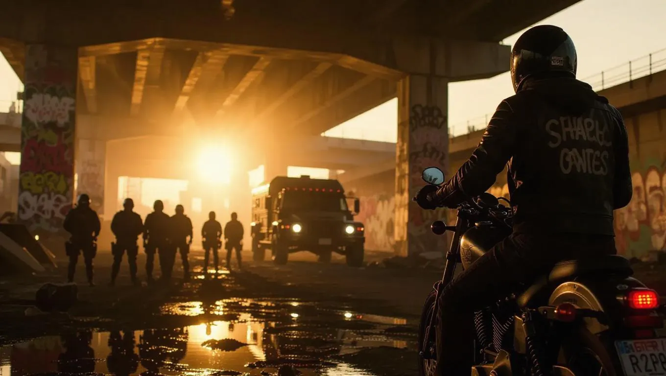 A faceless biker collective stands around a stranded armored truck beneath a worn-down overpass, blinding floodlights illuminating their forms, street art conveying narratives of rebellion behind.