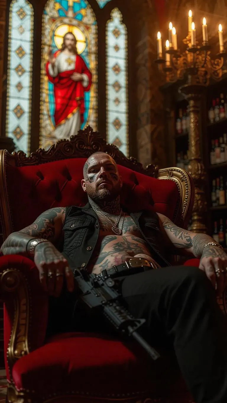 A heavily-tattooed gangster lies back in a red velvet armchair inside a baroque-style church turned hideout, gold candles flickering beside assault rifles and holy insignia. A stained-glass window showing God glows behind him, casting fractured color across his face. Baroque lighting meets street crime with chiaroscuro styling.