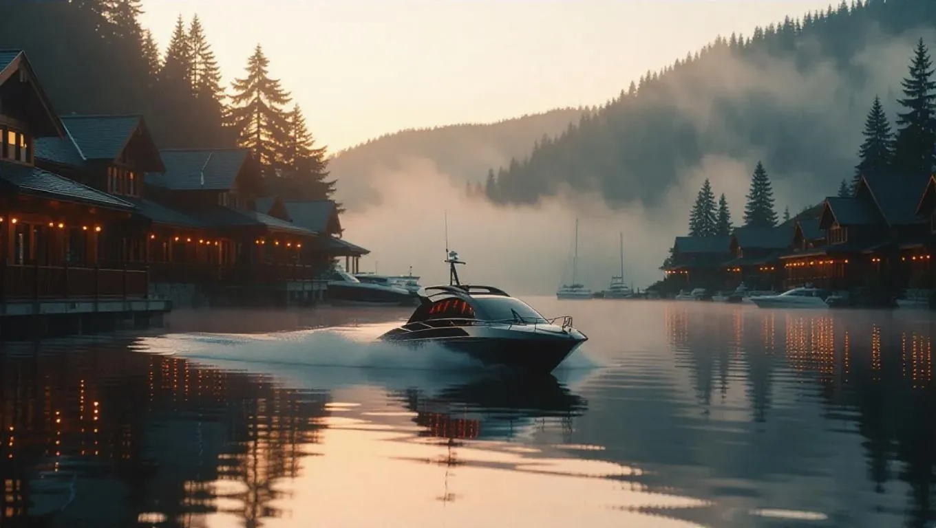 A getaway hover boat skims through a misty resort harbor, its team narrowly avoiding police surveillance. The scene is colored with the warm glow of lights and the chilly fog of the shore.
