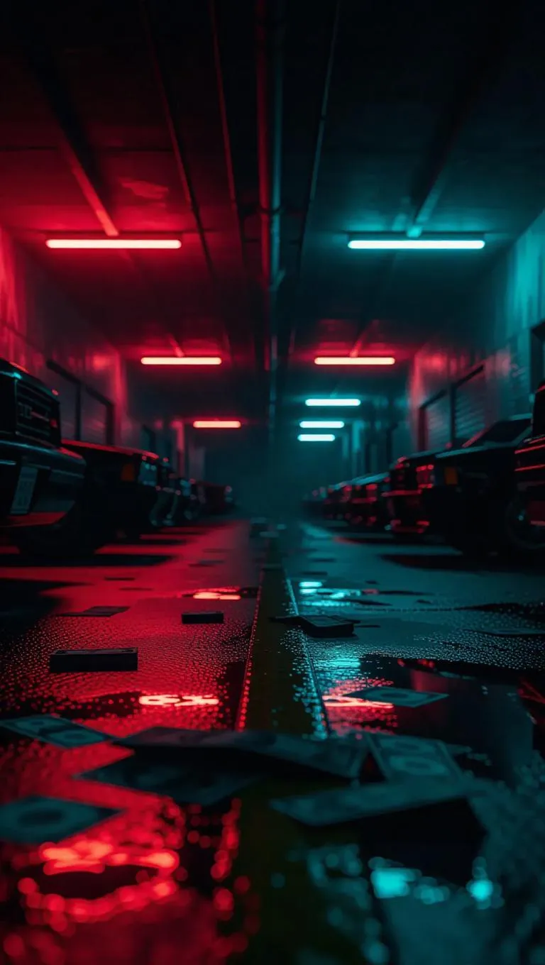 Within an eerie parking garage lost in shadows and buzzing fluorescents, a covert arms deal unfolds atop greasy concrete. Steel daggers glint beneath the light as rival crews glare at each other behind bulky eyewear and bold tattoos. A lone police car prowls outside, its siren glow bleeding through the grated entrance like a heartbeat. Burning sticks and disheveled cash float in slow motion, caught in the heavy silence before chaos. Cinematic composition favoring deep shadow with chromatic highlights, strong vanishing-point lines drawing focus toward the central exchange.