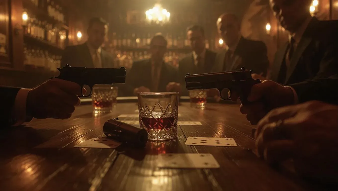 A secret poker game between rivals in a dimly lit bar, where guns lie beside fine scotch glasses and dirty hands hold winning hands. Shadows dance around flickering lights. Gritty, jazz-noir visual texture with heavy contrast.