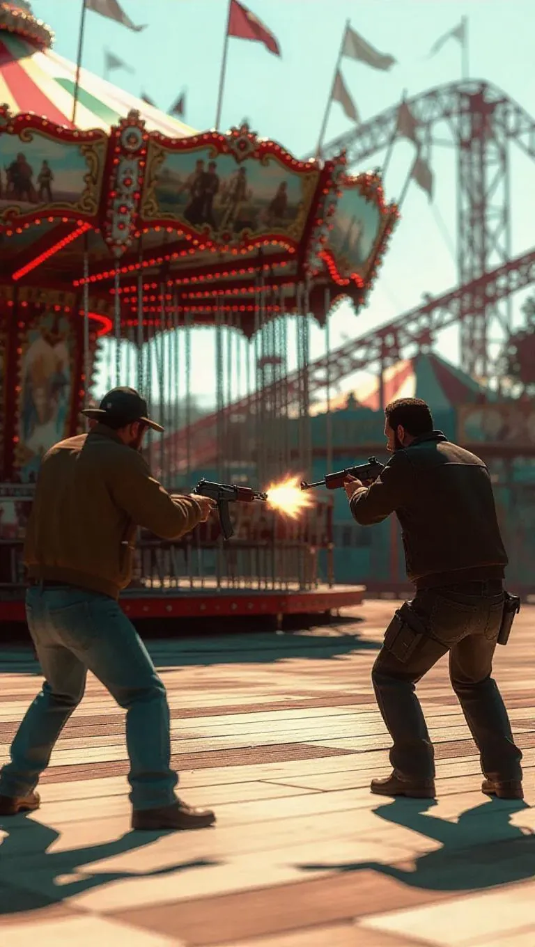 Two rival gangs confront each other in a rundown amusement park, weapons clashing and echoing off the rusting rides. Broken attractions and faded posters enhance the chaotic atmosphere. The scene is captured with a nostalgic, vibrant palette, emphasizing tension and danger.