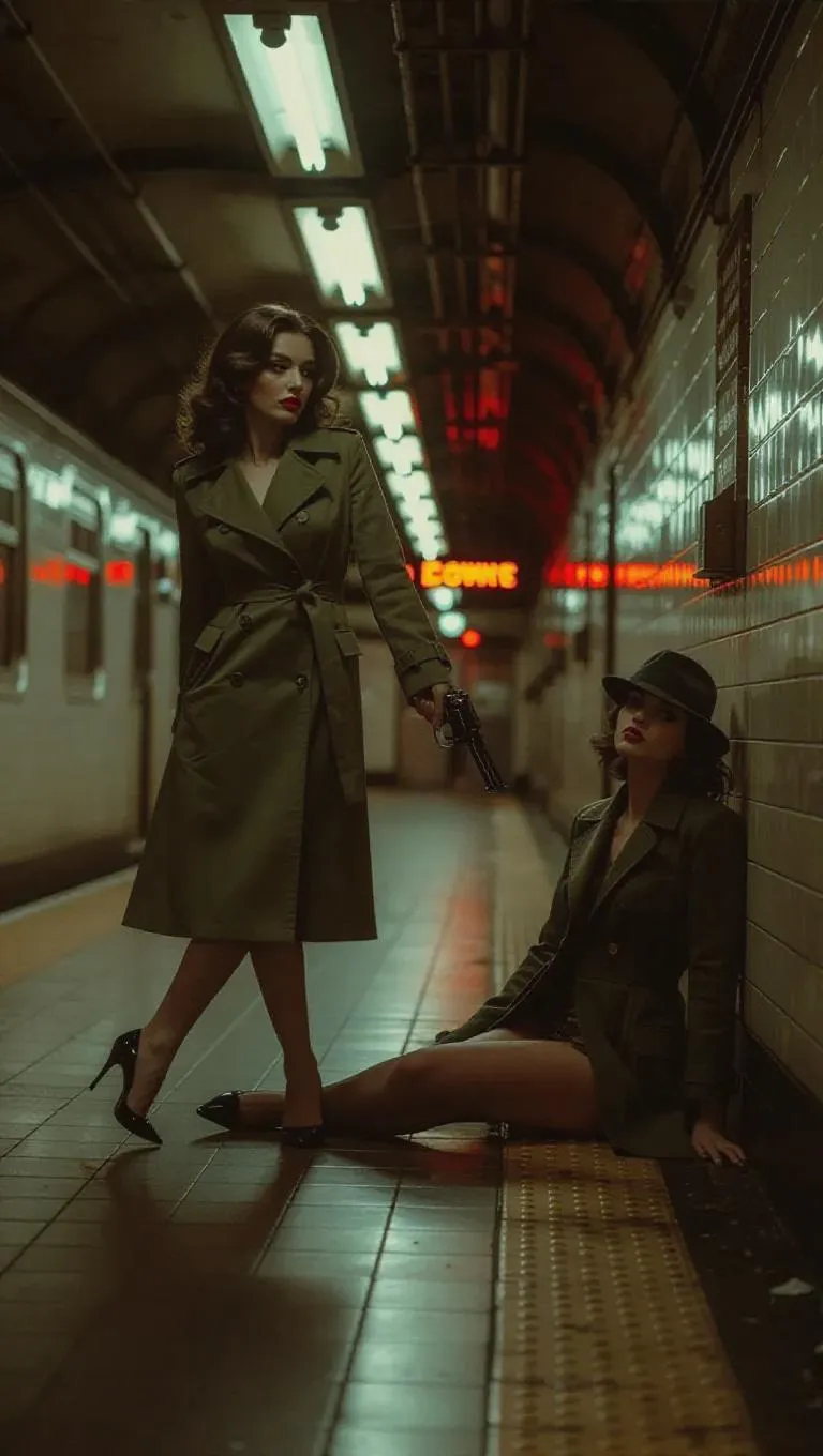 A stylish femme fatale in an olive green trench coat steps through an empty subway station, her heels echoing on the tiles, a revolver expertly held. Flickering lights above illuminate a lifeless figure sprawled by a broken payphone. Film noir motifs, stark lighting, faded palette.