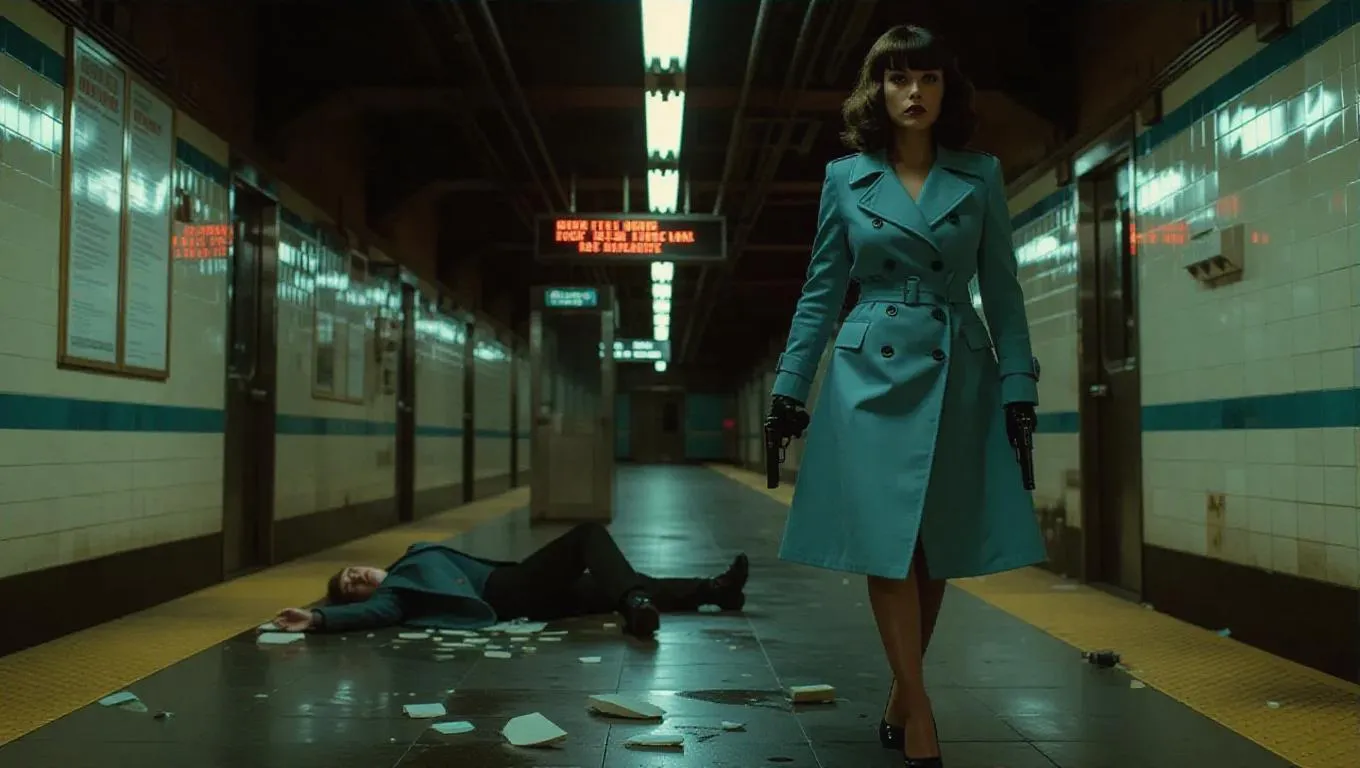 A striking femme fatale garbed in a powder-blue trench coat makes her way through an empty subway station, the sound of her heels echoing on the tiles, revolver in hand. A flickering overhead light exposes a fallen figure by a shattered information booth. Film noir essence, high contrast lighting, retro color palette.