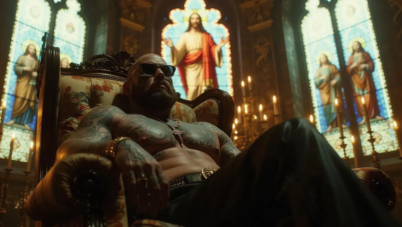 A heavily-tattooed gangster lounges in a silk-upholstered armchair inside a renaissance-style church turned hideout, gold candles flickering beside assault rifles and holy texts. A stained-glass Jesus glows behind him, casting fractured color across his face. Ambient lighting meets street crime with chiaroscuro styling.