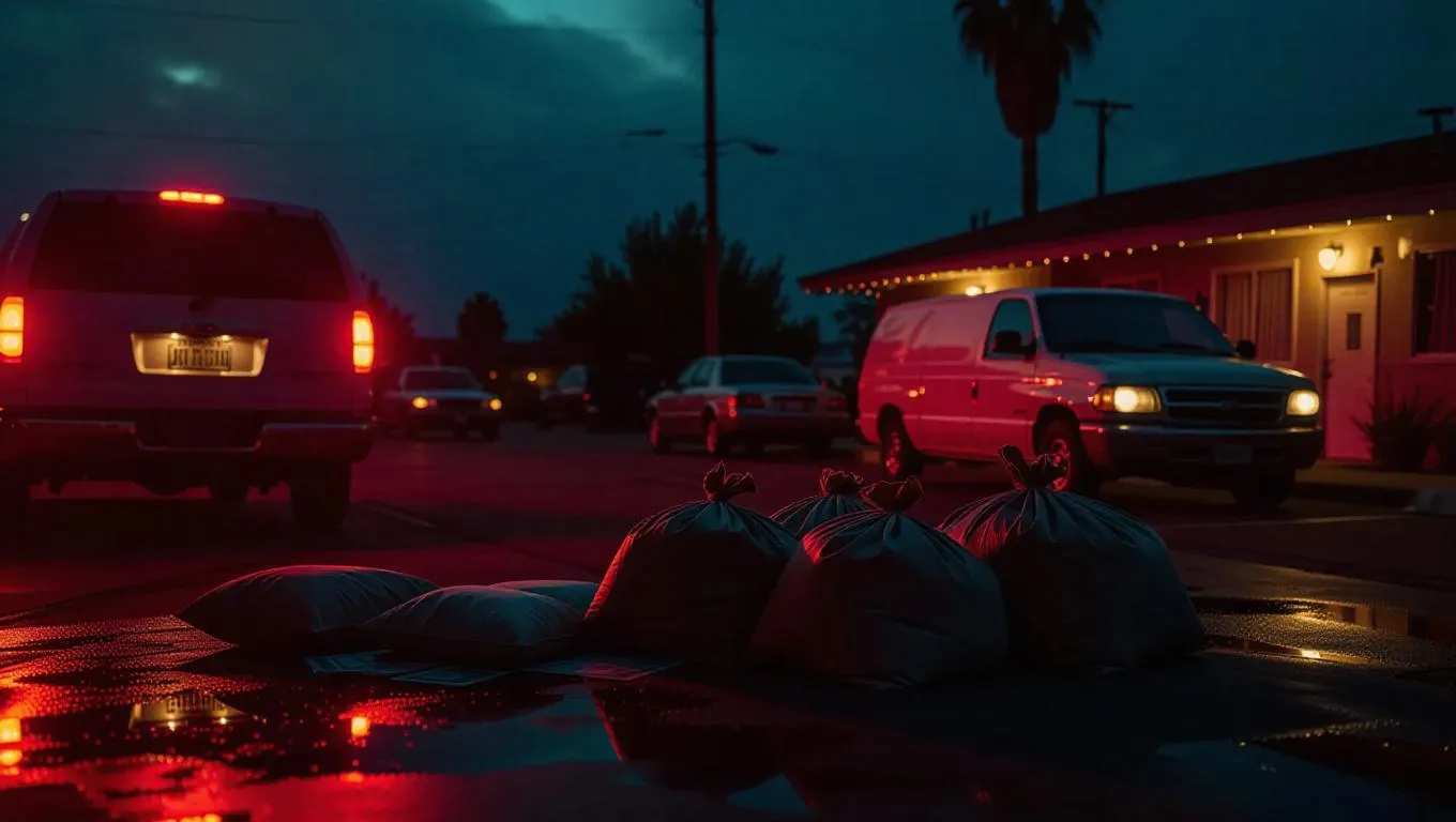 A tense exchange unfolds in a shady motel parking lot, duffel bags of cash and drugs spread on the hood of a lagging car. Headlights abruptly flood the scene as a white delivery van skids to a stop, capturing the chaos with instantaneous motion and a warm, pulsating atmosphere.