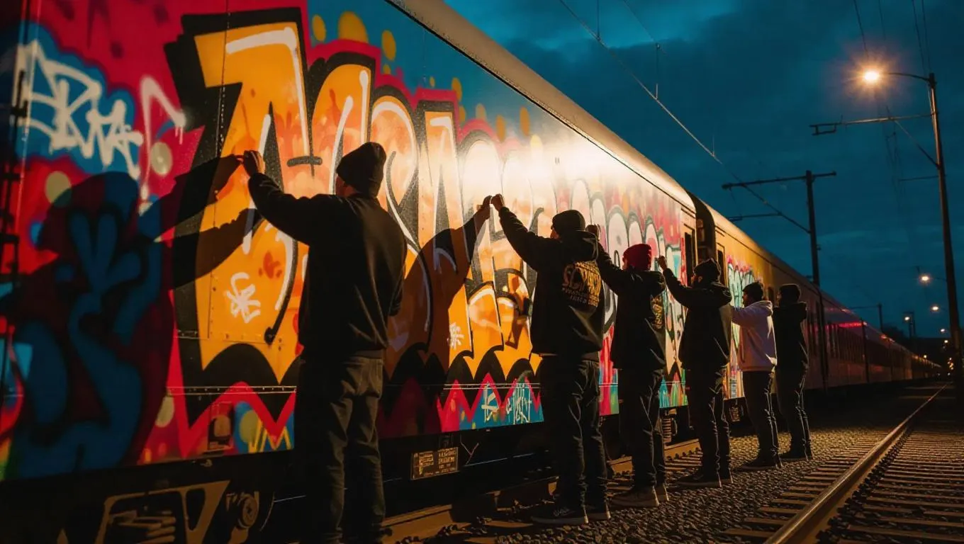 An assembly of graffiti writers applies paint to a huge mural on a train car, their shadows cast by the light from a streetlamp. The wailing of police sirens can be heard in the background, foreshadowing trouble. This scene boasts a rough, urban atmosphere with a warm color palette.