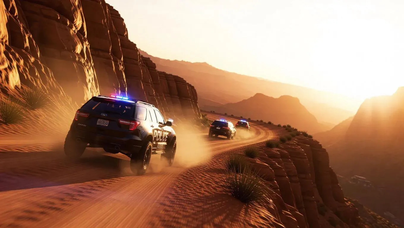A rugged off-road vehicle tears down a winding mountain road, kicking up dust and stones. Police SUVs follow closely, their sirens echoing through the canyon. The scene features dramatic cliffs and a dreamy sunset, emphasizing the high-stakes escape.