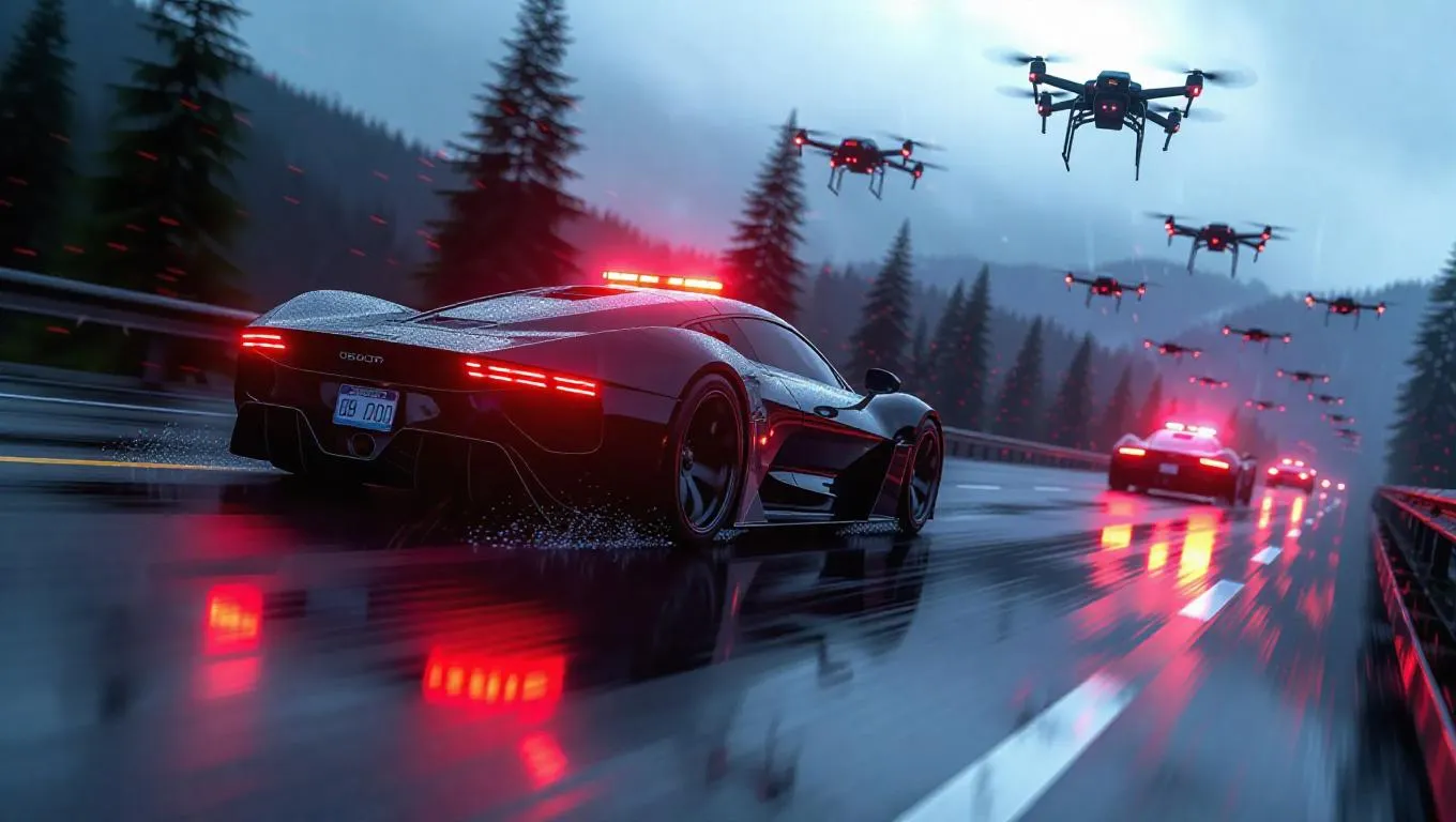 A futuristic car speeds down a rain-soaked highway, its tires screeching as it narrowly avoids a roadblock. Police drones and flying cars pursue relentlessly, their alarms creating a chaotic symphony. The scene is framed with dynamic motion blur and a sleek, cinematic palette.